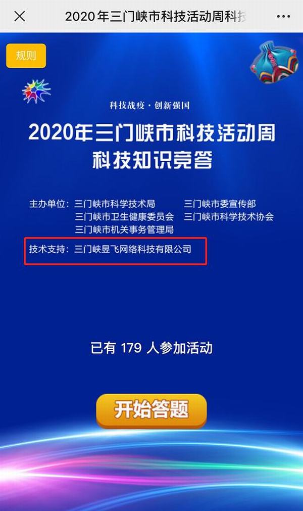 2020年三門峽市科技活動(dòng)周于8月21日上午在三門峽國(guó)際文博城西廣場(chǎng)舉行,三門峽昱飛網(wǎng)絡(luò)科技有限公司為活動(dòng)周“科技知識(shí)競(jìng)答”提供技術(shù)支持!